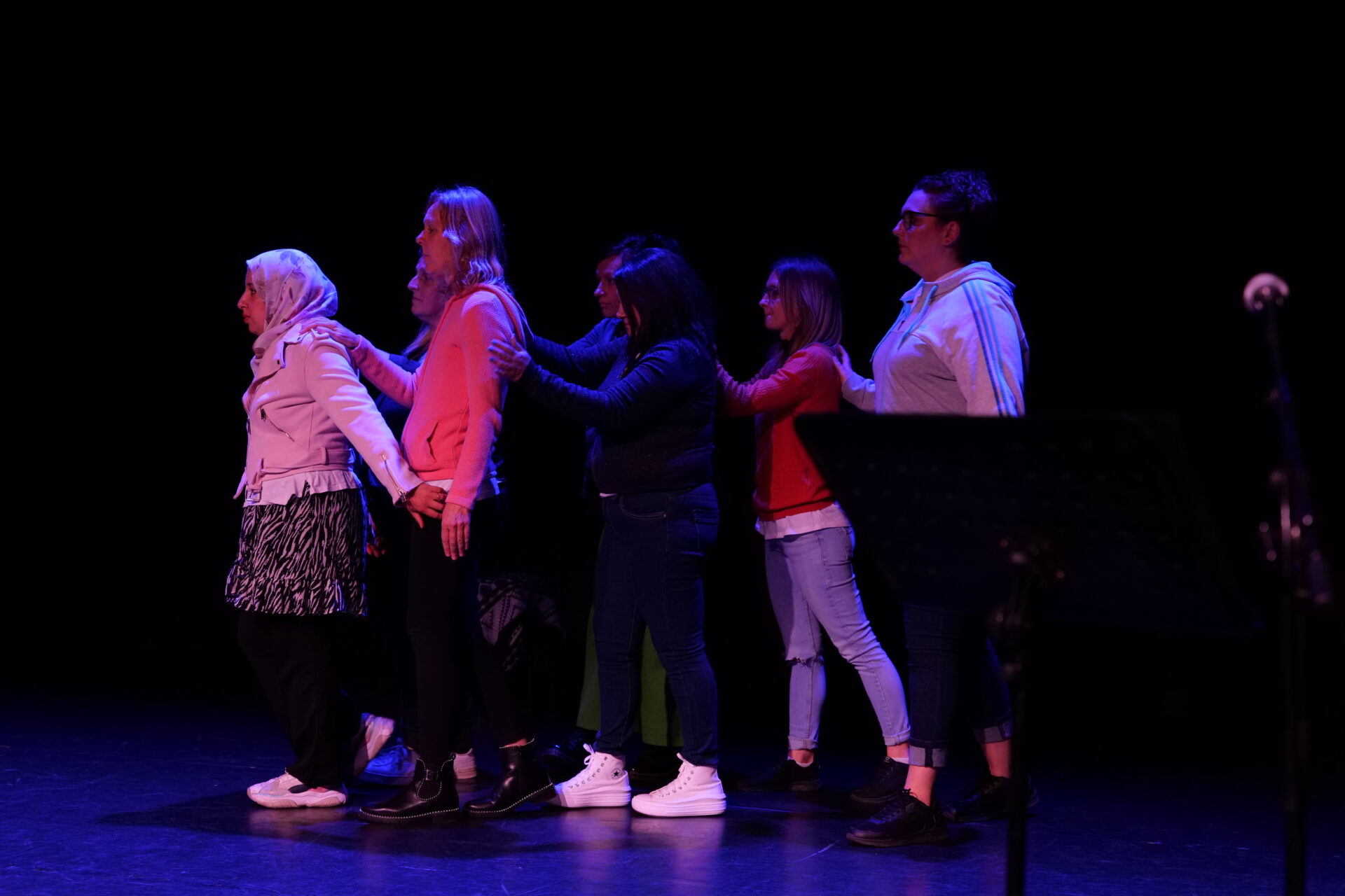Le projet Parentalité “ENSEMBLE” du Département du Nord a rassemblé au Phénix sept participantes Adeline, Isabelle, Michelle, Nabia, Sandrine, Sarah, Stéphanie. Accompagnées par la compagnie Lolium, elles ont rapidement formé un groupe uni et joyeux dans lequel le sensible et l’intime de chacune ont pu s’exprimer par le biais du théâtre.